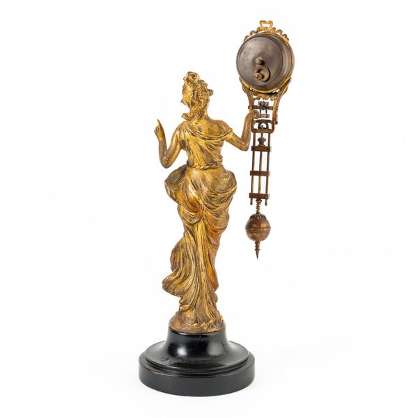 The figure holding a support bar for the clock and pendulum, raised on a turned ebonised wooden base