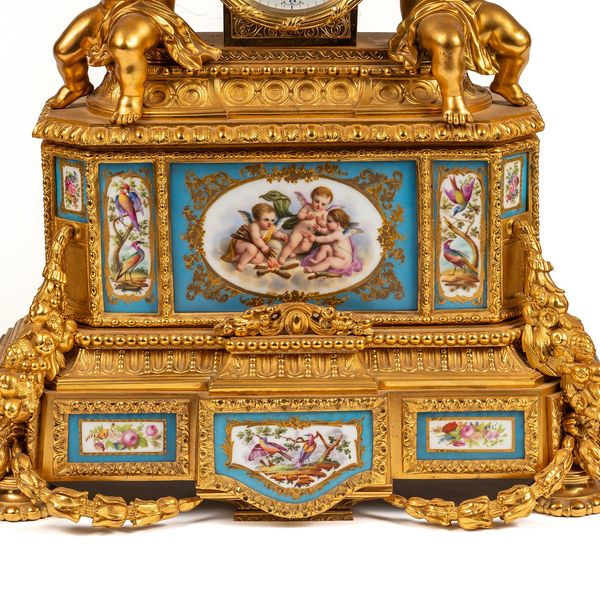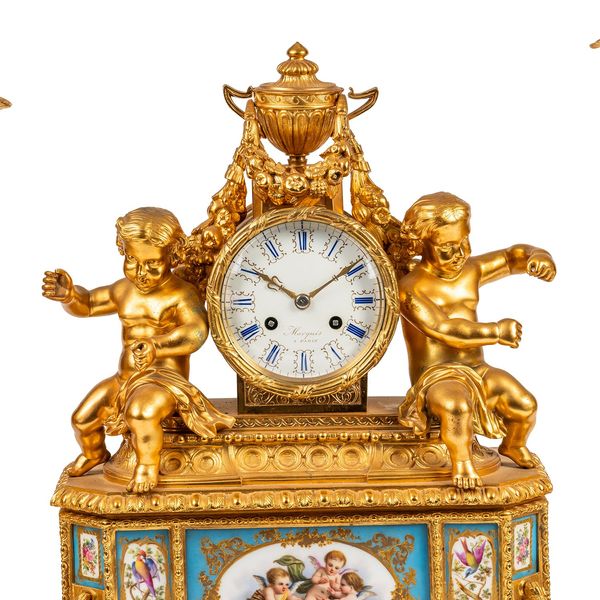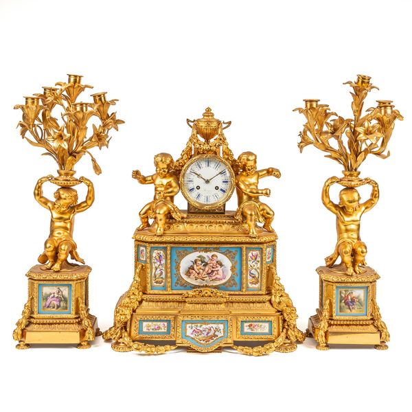 Comprising a pair of five-light candelabra and the mantel clock; the candelabra each modelled as a seated cherub supporting foliate-cast branches, on a canted rectangular stepped plinth, with berried laurel drops, on a stepped base and cast feet; the clock with a drum case flanked to each side by a seated cherub, surmounted by a classical urn with foliate festoons, above a stepped base with roundels, the canted base inset with multiple porcelain panels, decorated with cherubs, birds and foliage within gilt reserves, with further foliate drops and berried laurel festoons, the twin train movement with white enamel dial, striking the hour and half on a bell