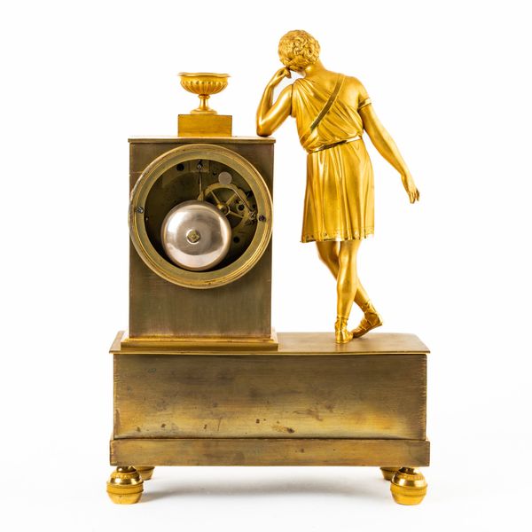 The case modelled with a standing classical figure, his arm resting beside an urn, above the 3 1/2in signed white enamel dial, above a plinth with oak leaves, swags and anthemion, on bun feet, the drum-shaped twin train movement with countwheel strike on a bell