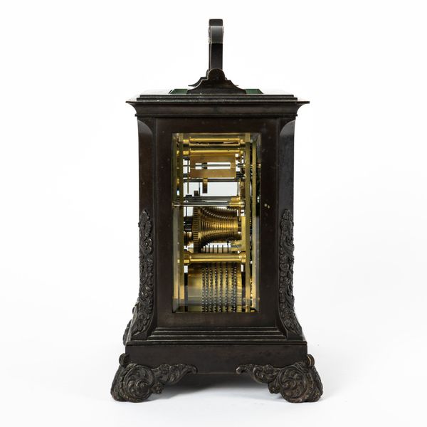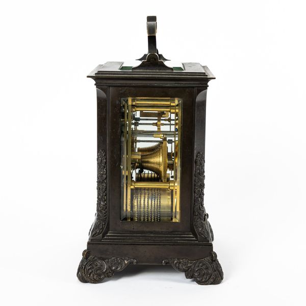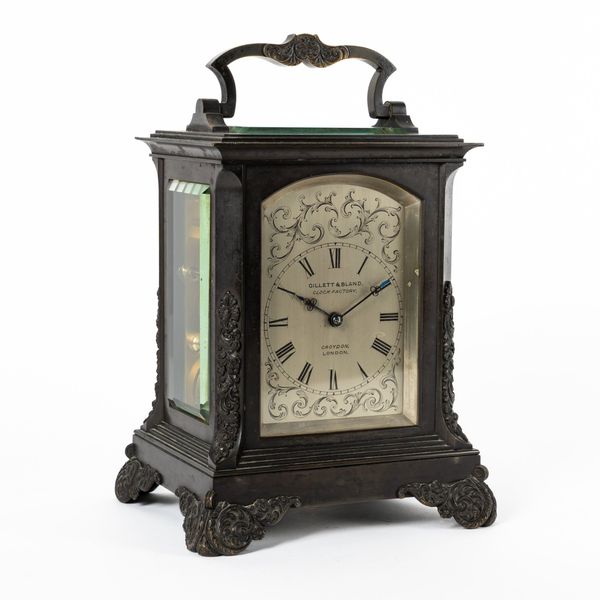 The clock case with deeply cut bevelled glass panels to the top, front and sides, below a swept handle, with moulded cornice and canted angles with foliate mouldings, on a stepped base and foliate cast feet, the 4 1/2in rectangular silvered dial with pierced blued steel trefoil hands, signed to the centre GILLETT & BLAND / CLOCK FACTORY / CROYDON, with foliate scrolls to top and base, the fine quality twin train chain fusée movement, stamped on the backplate 0658 (inverted), with large platform and three-arm brass balance, lever escapement, maintaining power and striking the hour on a bell, with solid shuttered rear door, locked by a square from the underside of the base, with its original oak case and a brass double-ended key