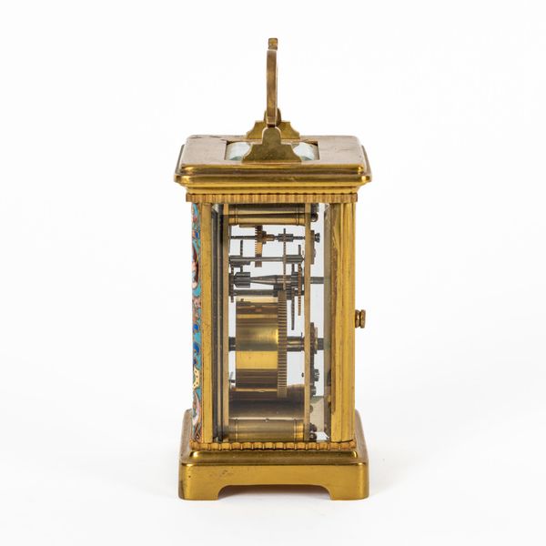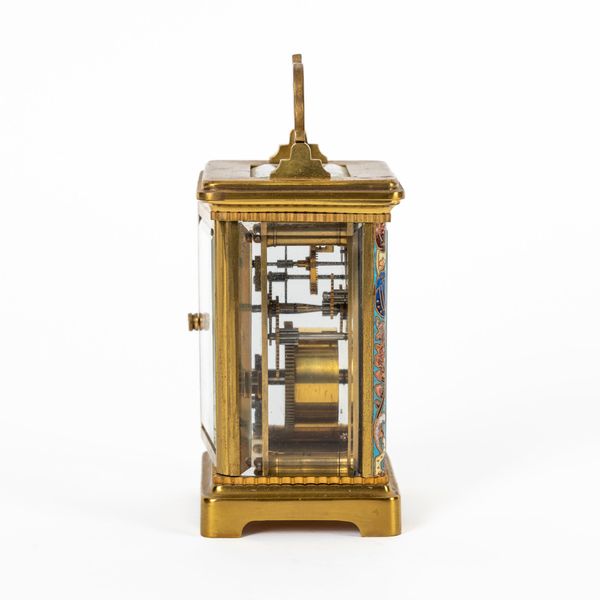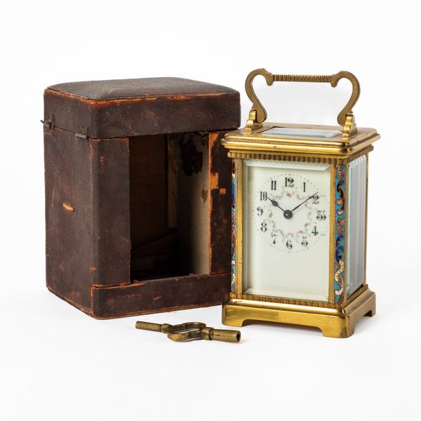 The case with a reeded scrolled handle, the front uprights each inlaid with polychrome cloisonné enamel decoration, off white enamel dial with foliate festoons, platform lever escapement, with travelling case