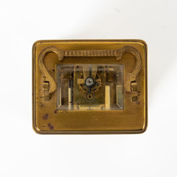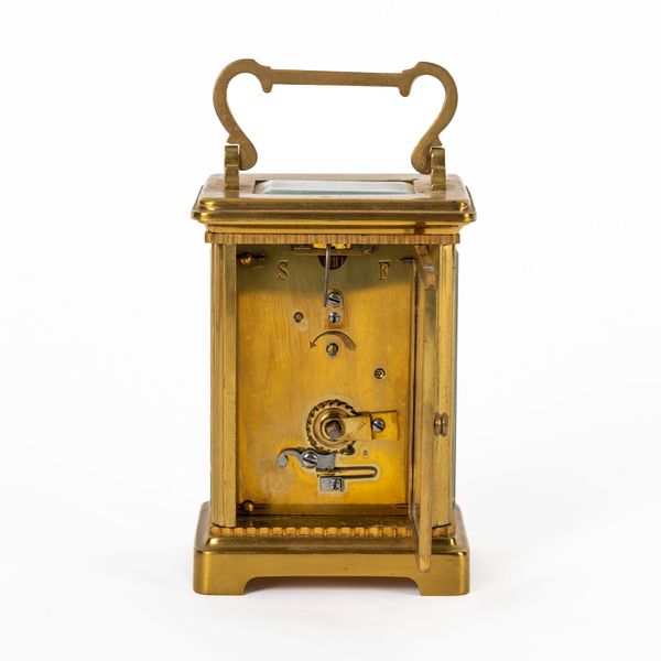 With winding key and travelling case, damaged. The clock requires a service as not working. The back door glass has a chip to the upper edge.