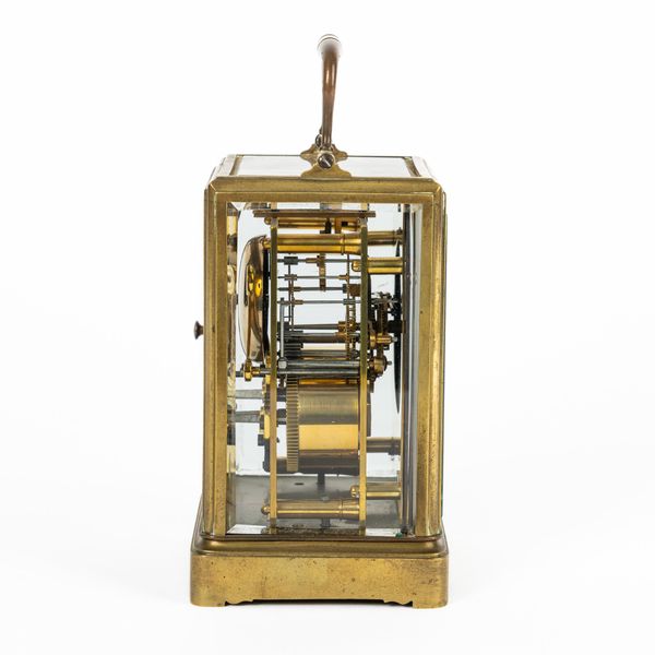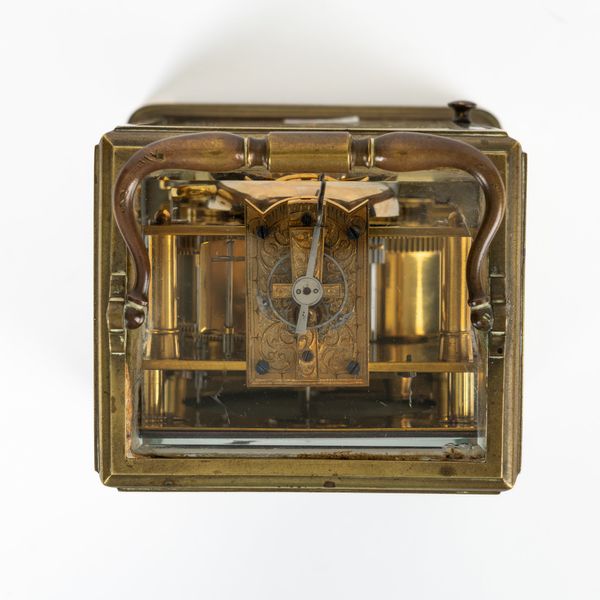 With a double-ended key. The clock is ticking. The strike works. Dial has a small star crack in bottom right corner. Top glass has chip to right front corner. Back door glasses is ‘nibbled’ to edge on top right as well as bottom right and bottom left. The case has no gilding and is dirty.