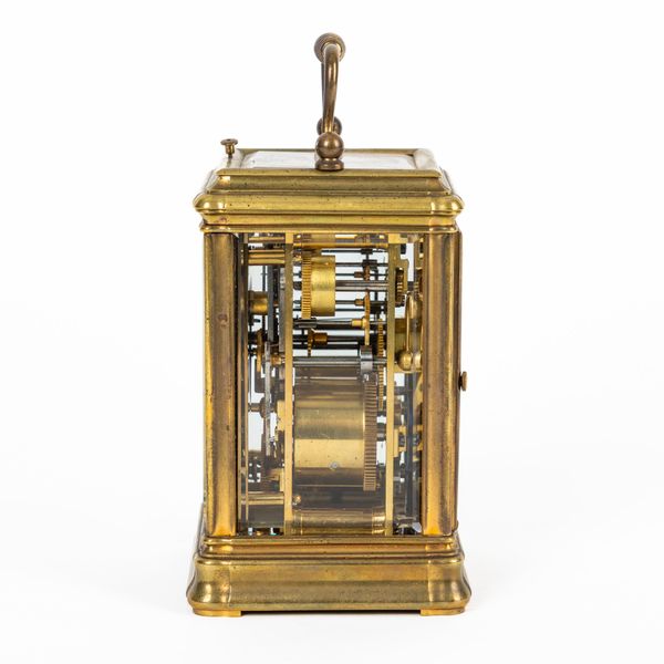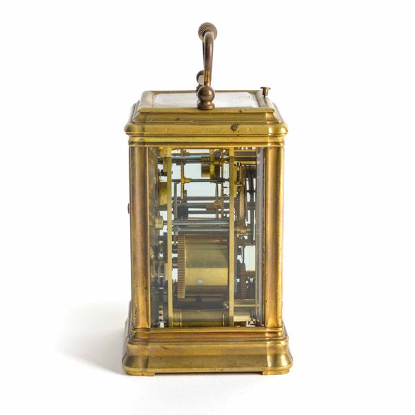 With replaced handle above large rectangular top glass, white enamel dial with blued steel moon hands and alarm subsidiary, the twin train movement with silvered platform lever escapement, striking and repeating on a blued steel coiled gong