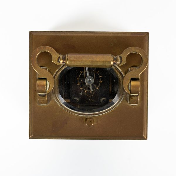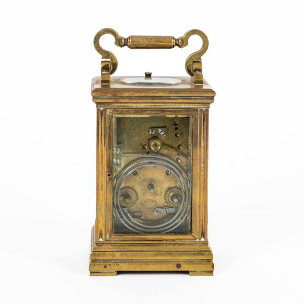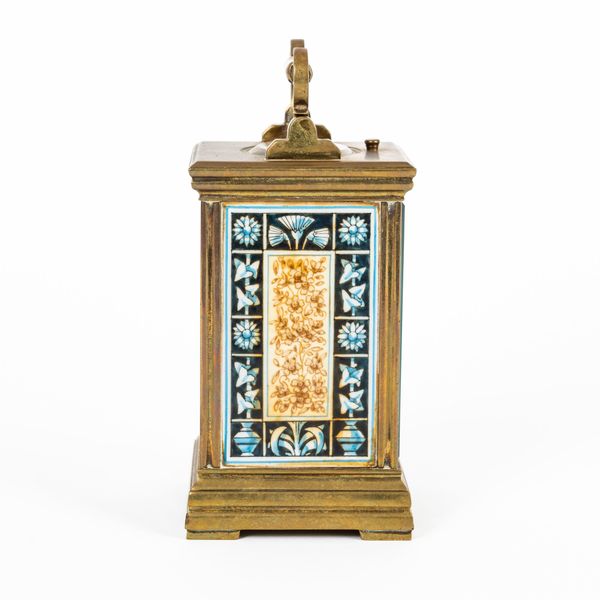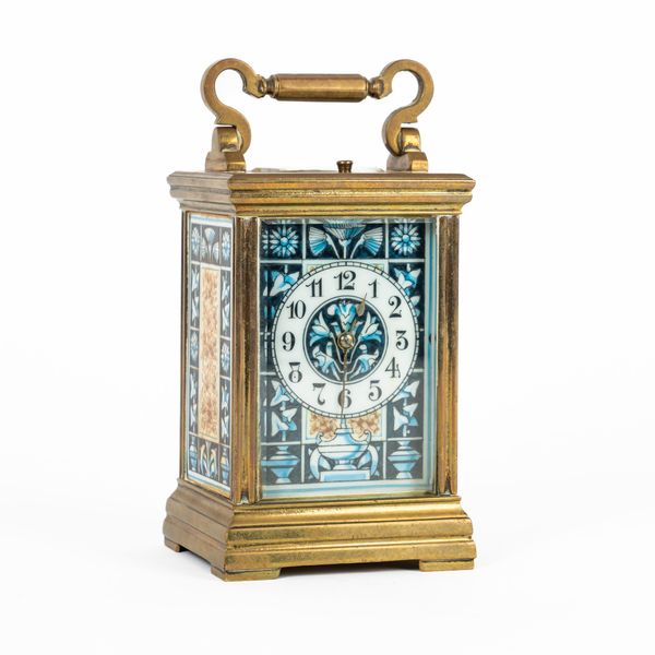 With scrolled handle above an oval top glass, the sides and dial painted with reserves of flower heads and with a central rectangular field of flower heads, the twin train movement with original silvered platform lever escapement and push/repeat on a blued steel gong, the backplate stamped GL in an oval