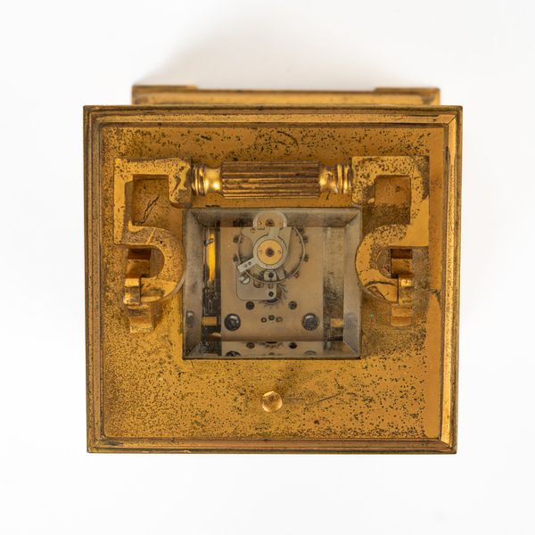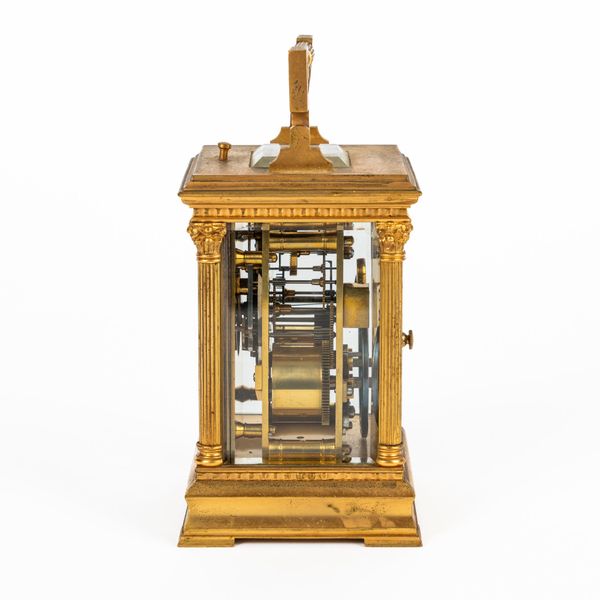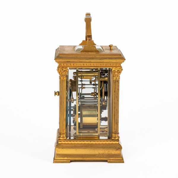 The Anglaise Riche style case with bevelled glass panels, shaped handle, push/repeat above fluted classical three-quarter columns, the twin train movement with replaced silvered platform lever escapement, striking the hour and half on a blued steel gong