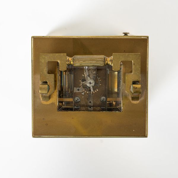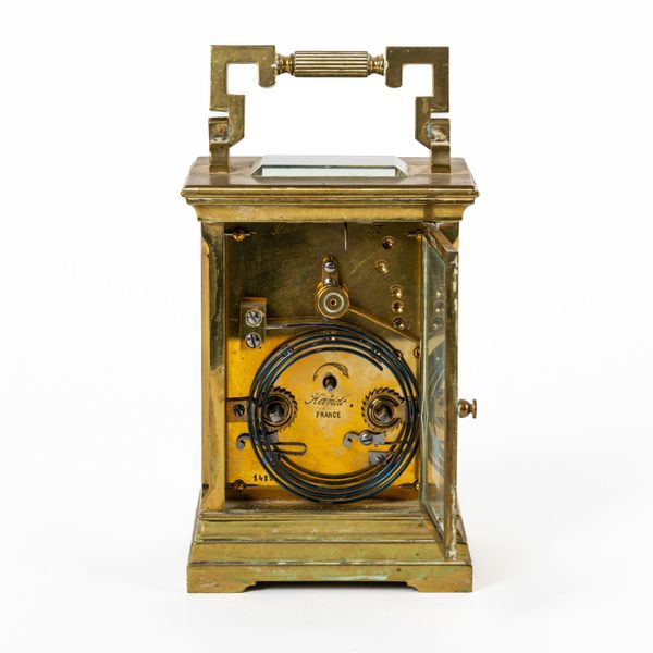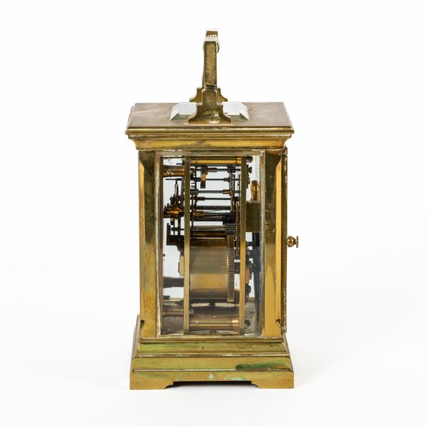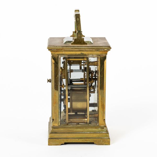 The brass case with Greek-key handle, above the dial with a matt gilt mask, cream enamel chapter ring, blued steel hands and Gothic arch-style central pierced boss, the twin train movement with original platform, lever escapement and compensated balance, striking the hour and half on a blued steel gong
