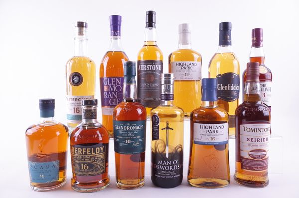 Scapa Orkney Aged 16 Years; Aberfeldy Highland 16 Years in Oak; The Glendronach Sherry Cask Matured 16 Years; Man O' Sword Annandale French Ex-bourbon Cask 10 Years; Highland Park Aged 16 Years; Tomintoul Seiridh Speyside Oloroso Sherry Cask Limited Edition; The Glenlivet Sherry Cask 13 Years; Glenfiddich Distillery Edition 15 Years (1L); Highland Park Aged 12 Years; William Grant + Sons Aerstone 'Land Cask' 10 Years; Glenmorangie The Vindima 16 Years (1L); Fettercairn Highland Aged 16 Years