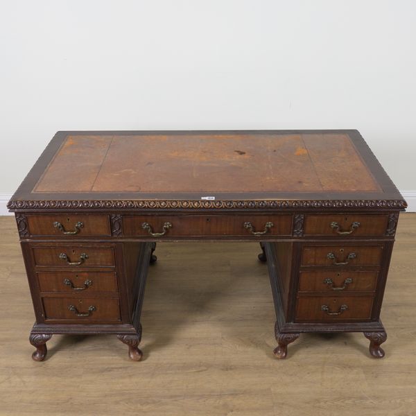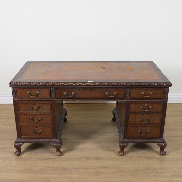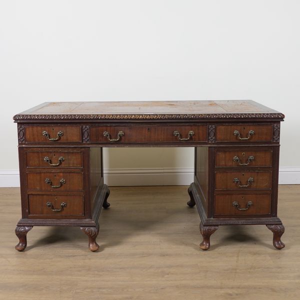 AN 18TH CENTURY STYLE CARVED MAHOGANY NINE DRAWER PEDESTAL DESK