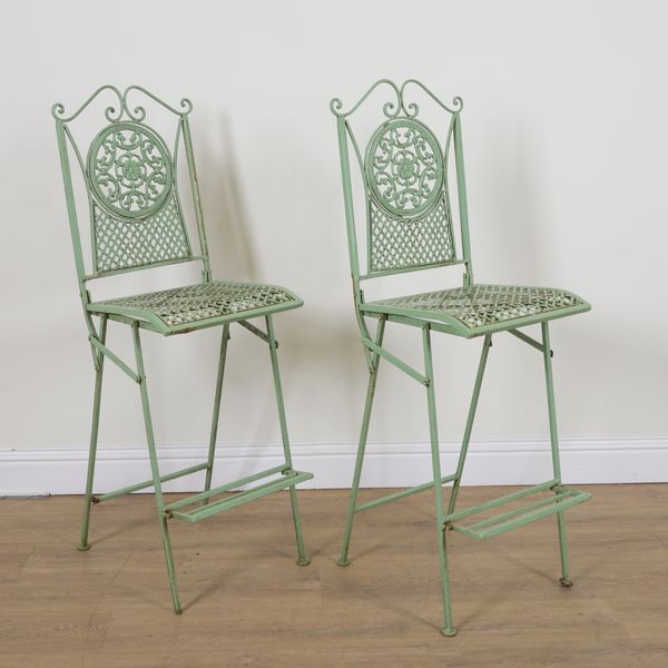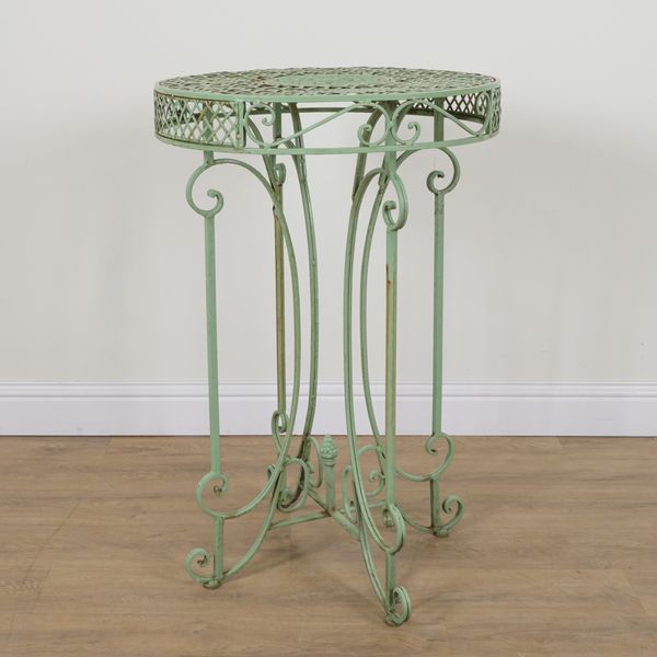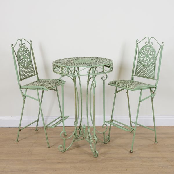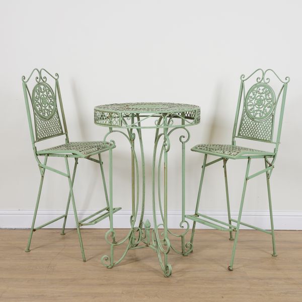 A 20TH CENTURY GREEN PAINTED METAL CIRCULAR HIGH CAFE TABLE (3)