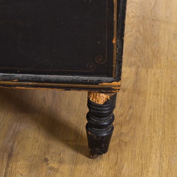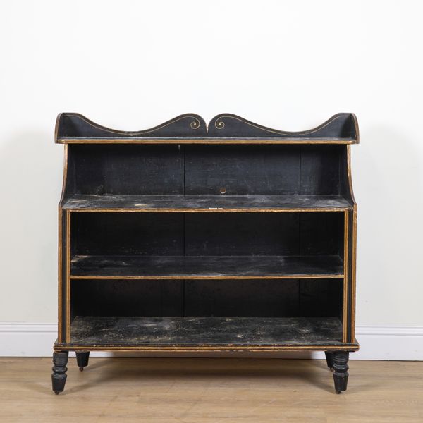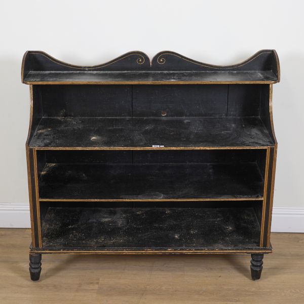 A REGENCY EBONISED PARCEL GILT DECORATED WATERFALL BOOKCASE