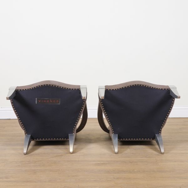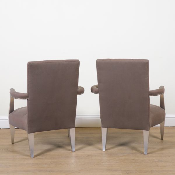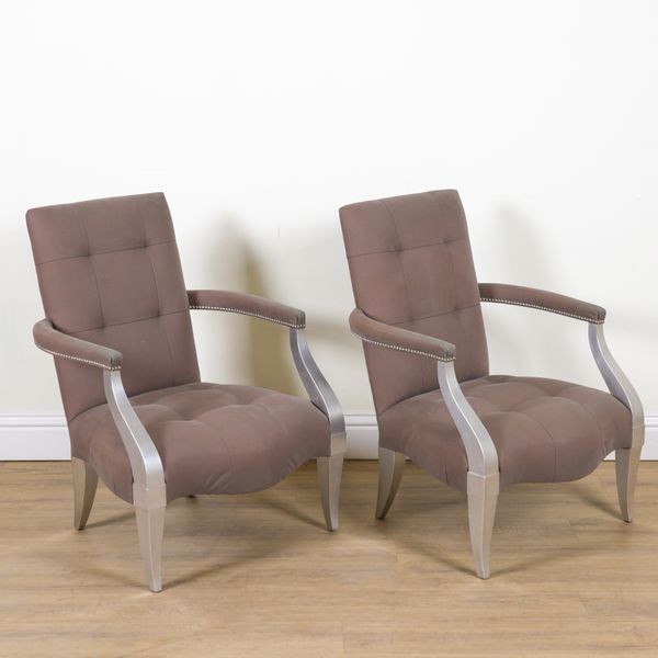 DONGHIA; A PAIR OF SILVER PAINTED UPHOLSTERED OPEN ARMCHAIRS (2)