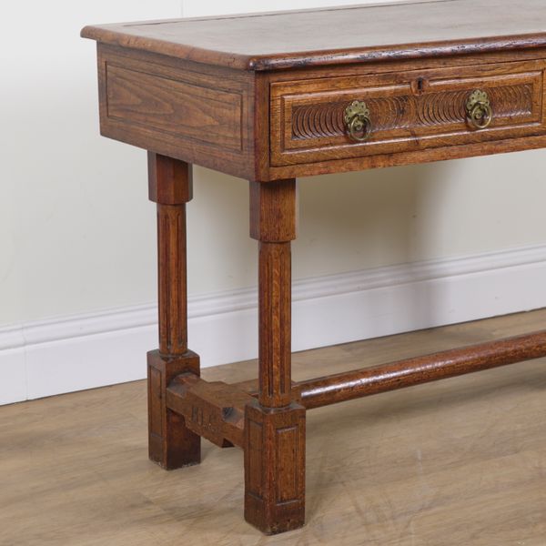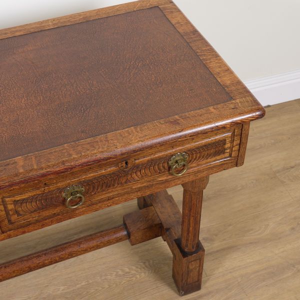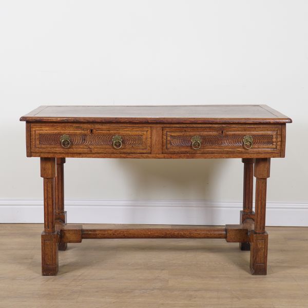 A VICTORIAN GOTHIC REVIVAL OAK TWO DRAWER WRITING TABLE