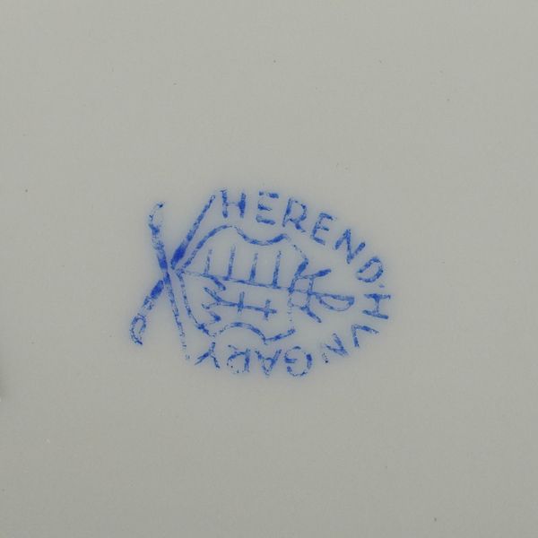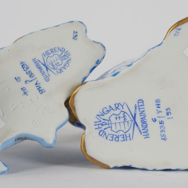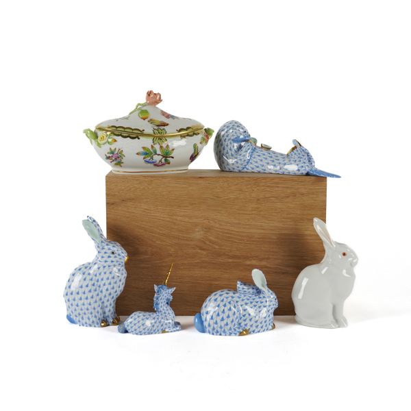 Comprising; a blue fishnet otter with oyster, 20cm length; a blue fishnet seated rabbit, 14cm high; a blue fishnet recumbent rabbit, 11.5cm length; a blue fishnet unicorn, 8cm length and a white glazed seated rabbit, 14cm high, blue printed and painted marks; also a Herend Queen Victoria pattern two-handled tureen and cover, blue printed mark, 18cm wide