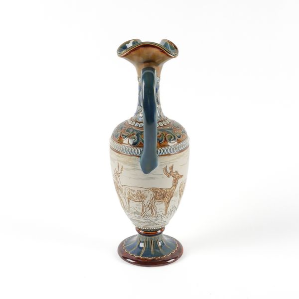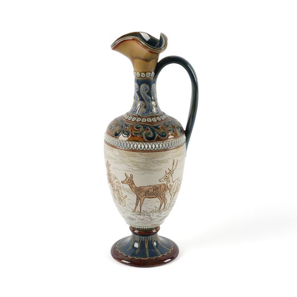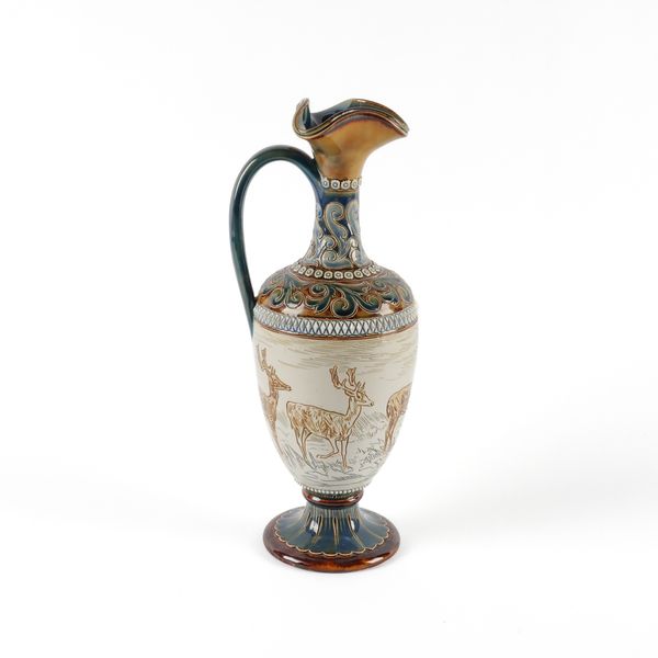 A trefoil stoneware ewer or pitcher/jug with incised decoration of deer and stags, typically glazed in blue and brown, impressed marks and artist's monogram to base, 31cm high