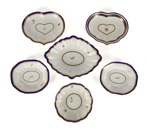 Including; a Derby blue and gilt lozenge shaped stand, a heart shaped dish, circular dish and pair of canted rectangular dishes; a Derby heart shaped dish with central garter star; two Derby white a gilt spiral fluted teabowls and six saucers; a Derby fluted cup and saucer; a pair of blue and gilt teabowls; four coffee cans; various white and gilt teabowls and saucers and two other saucers