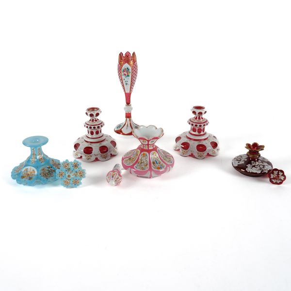 Pink overlay scent bottle - shallow glued chip to the outside of the rim, approx. 1cm square. Tiny nick to the rim. Some wear to the gilding.