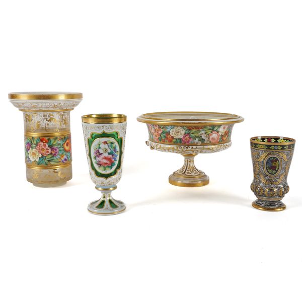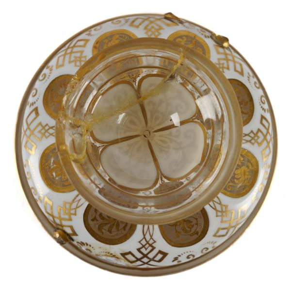 Tazza- both handles are lacking. Large chip to the inner rim, approx. 2cm by 1cm. Long crack across the base of the bowl, approx. 12cm length. Glue repairs and chips to the foot. Some overall wear. Pedestal- some wear to the gilding