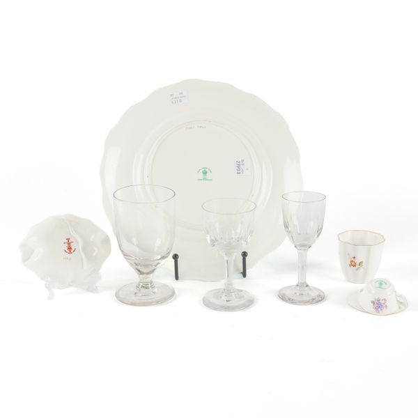 Comprising; a trinket dish from the Country pursuit series, circa 1937, painted with a pointer by C.Gresley, signed, 9.5cm wide; a cabinet plate, painted by W E J Dean, signed with a named view, `Chee Dale', against a duck egg blue ground, 22.5cm diameter; a miniature cup and saucer and a `Posies' egg cup, circa 1991, printed marks; also three various drinking glasses