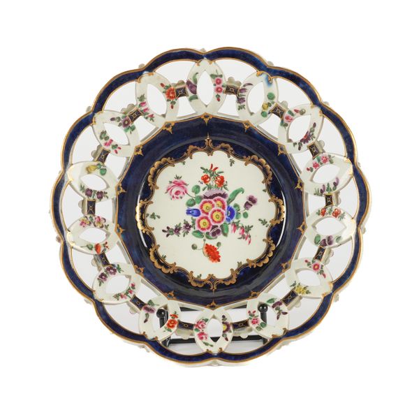 Circa 1770 Pierced with intersecting circles applied on the exterior with florets, the centre painted with a group of flowers against a `wet blue' ground, blue fretted square mark, 22.5cm diameter