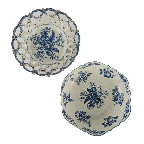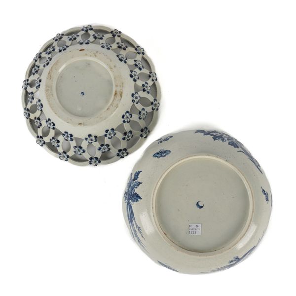 Junket dish- some black specking to the glaze on the exterior, otherwise in good conditionBasket- some small areas of restoration