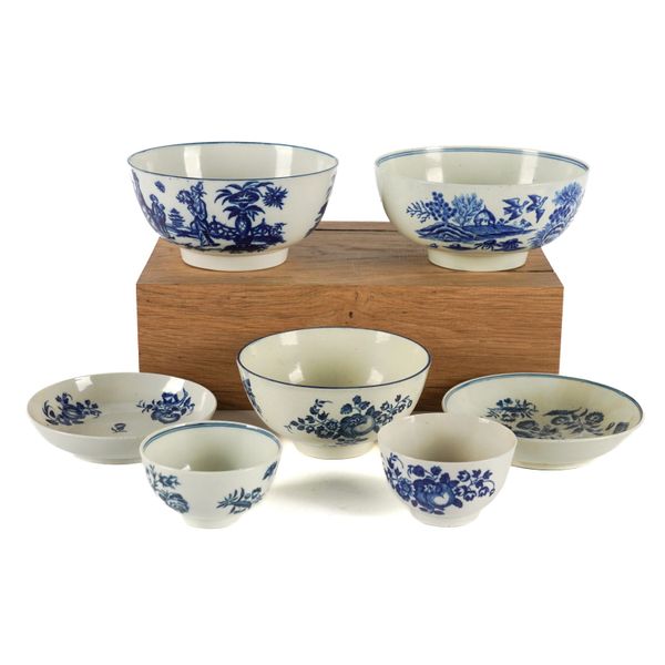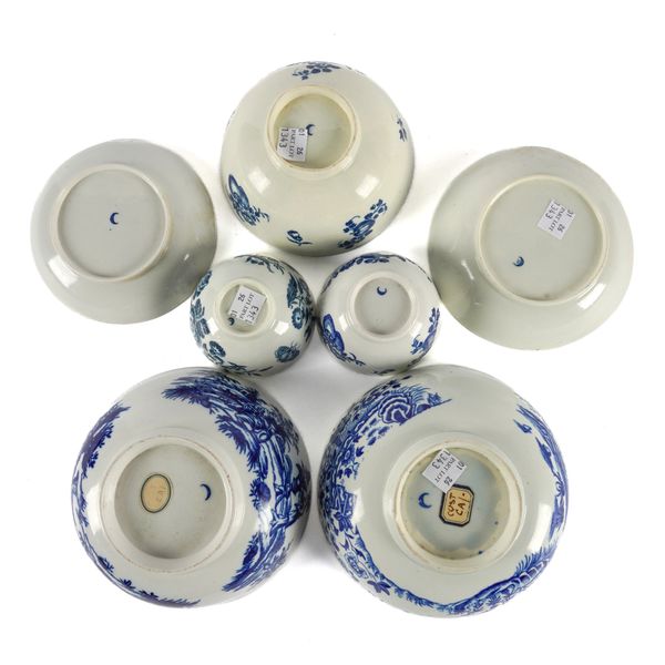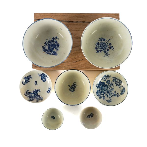Comprising; a `Mother and Child' pattern bowl, 14.5cm diameter; a `Fence' pattern bowl, 15cm diameter; a small bowl and a teabowl and saucer printed with fruit and flower sprigs and a `Three Flowers' pattern teabowl and saucer, hatched crescet marks