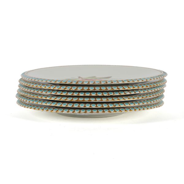 Six plates- one extensively and stained. Three with chips to the underside of the rim. Some light surface scratches