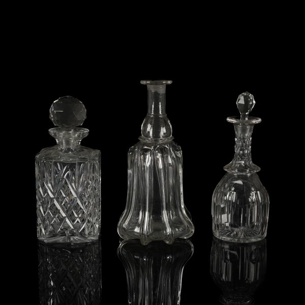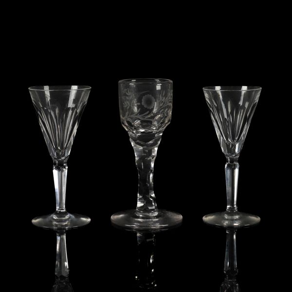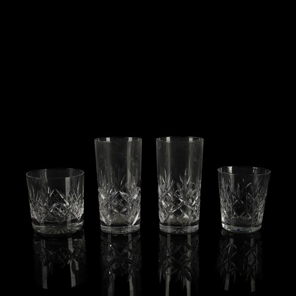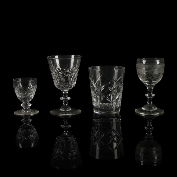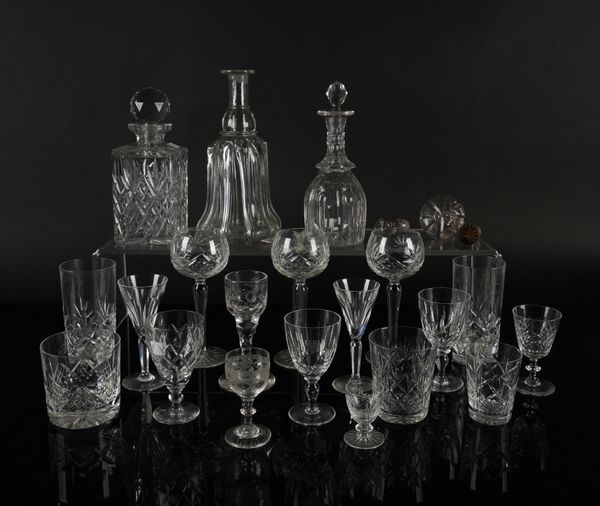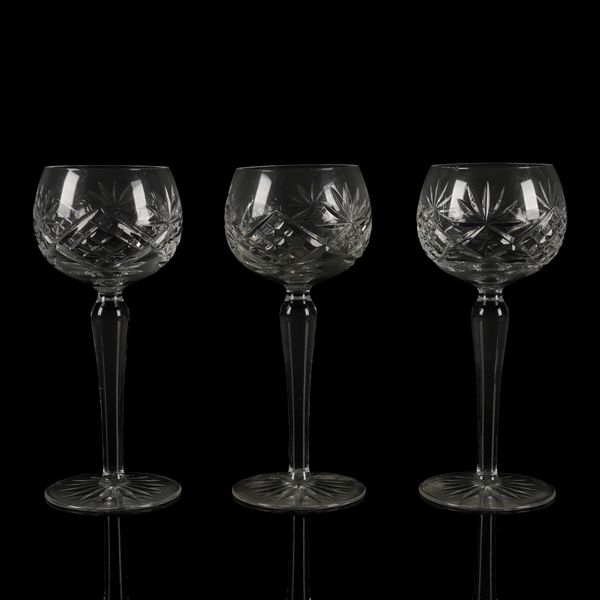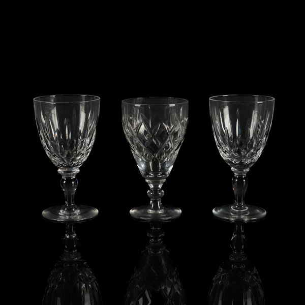 The facet stemmed wine glass has a crack to the bowl. One of the sherry glasses with bucket bowls has a small rim chip. The stopper on the spirit decanter has some chips a round the bottom rim. Some small chips to some of the other stoppers. Otherwise in overall good condition