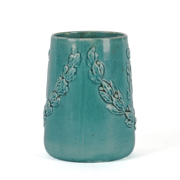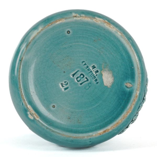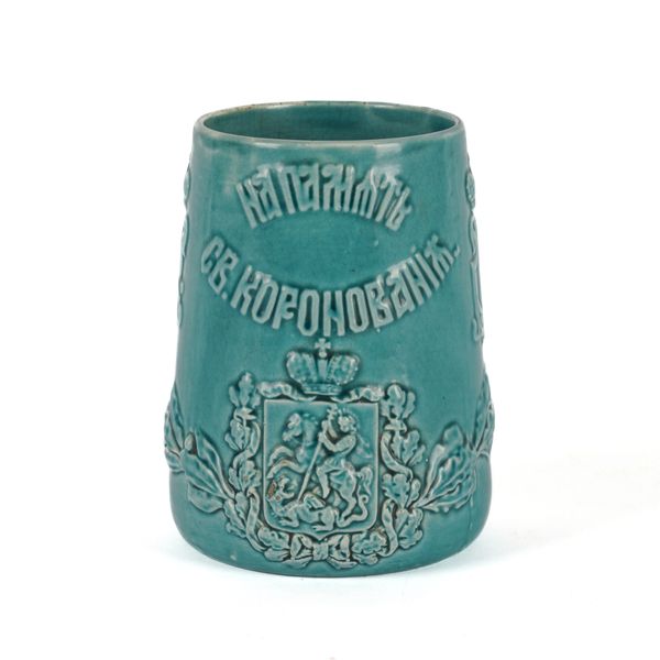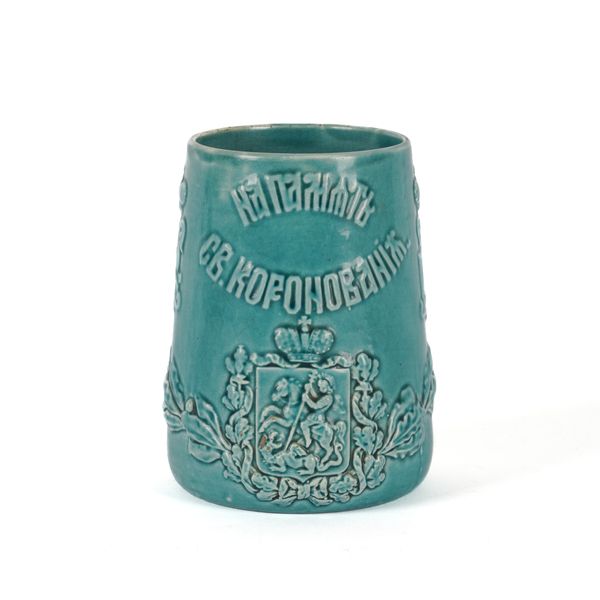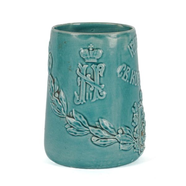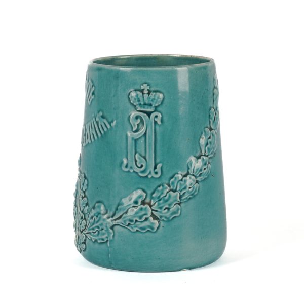 Blue glazed ground, moulded with Russian text above the Muscovite arms, flanked by the ciphers of Tsar Nicholas II and Tsarina Alexandra Feodorovna within laurel sprays, stamped mark, 12cm high