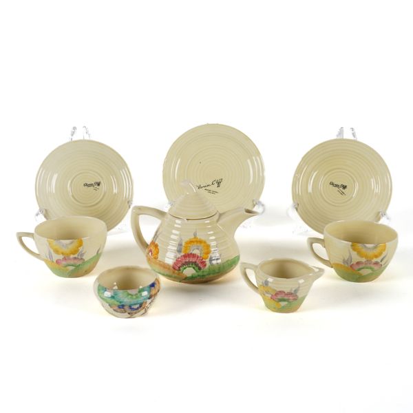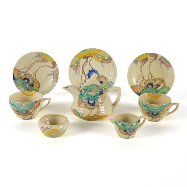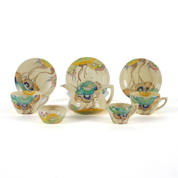 1930s Wilkinson 'Bizarre' Comprising a teapot, two teacups, two saucers, a trio plate, a milk jug, and a sugar bowl, variously marked to bases