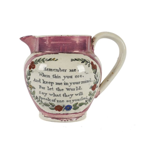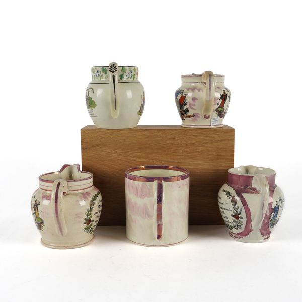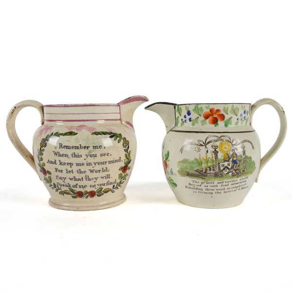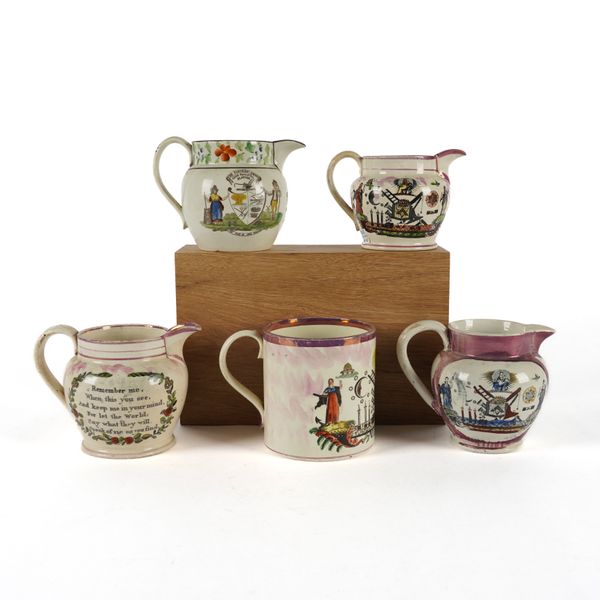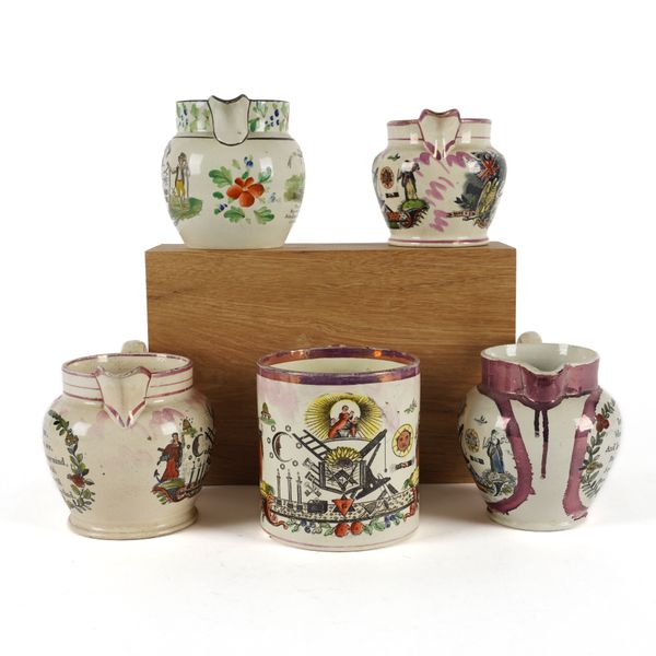19th century Pearlware with transfer printed Masonic emblem overpainted with enamels, together with four pearlware and Sunderland lustre Masonic jugs