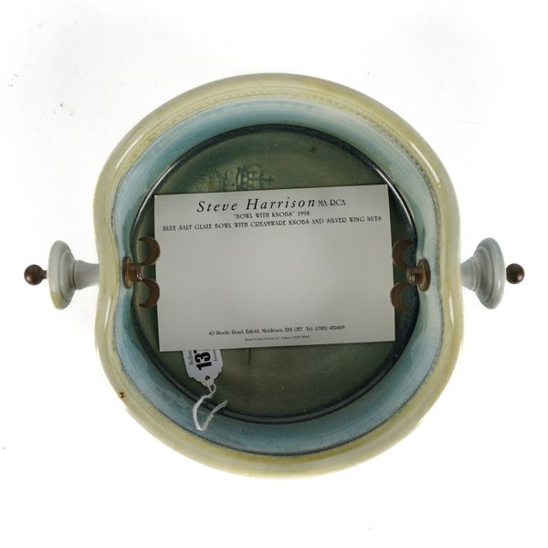 A SALT GLAZED STUDIO POTTERY BOWL WITH KNOBS BY STEVE HARRISON