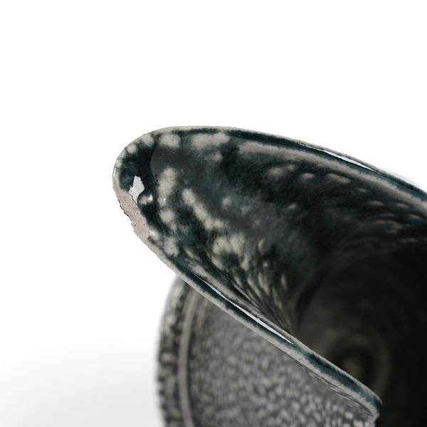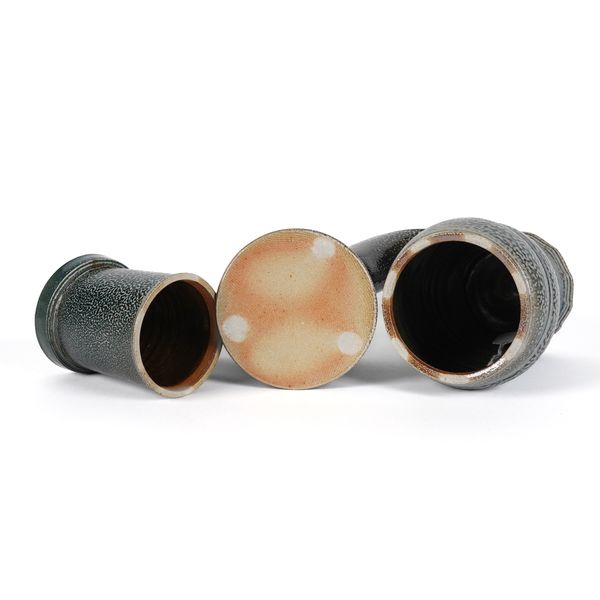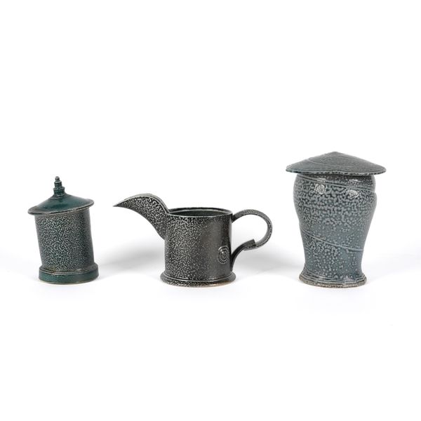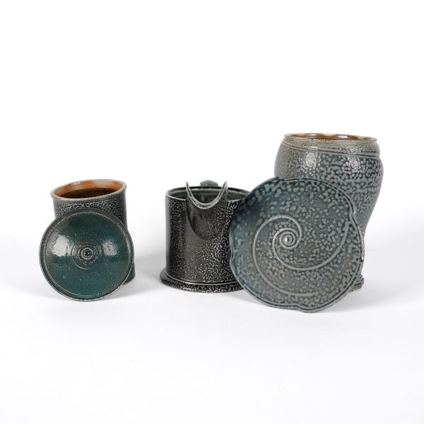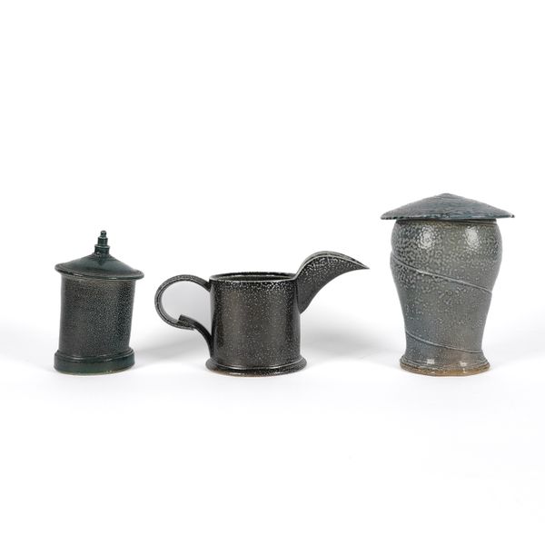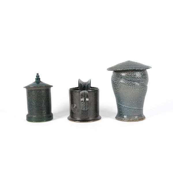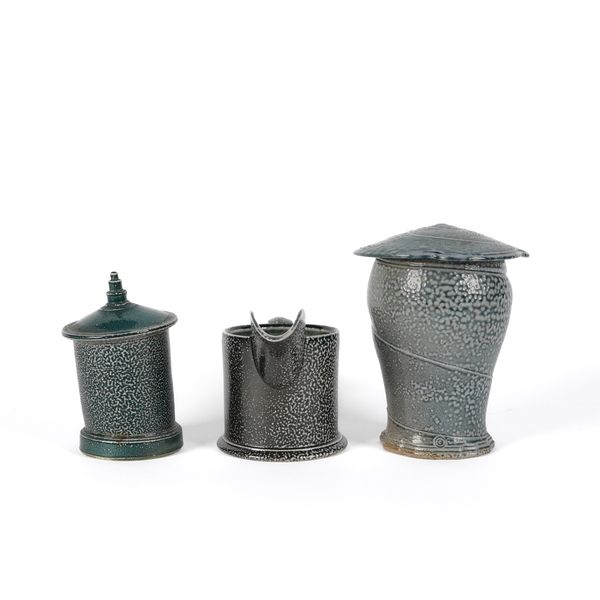 Glazed in mid/dark-blue with orange peal texture, pulled handle, and with potter's concentric circle mark to side, together with a Walter Keeler salt glazed lidded jar of tapered, conical form, with twisted decoration, glazed in mid-blue with orange peel texture, the cover of quatrefoil, lobed form, impressed artist's concentric circles mark to side, 18cm high, and a Walter Keeler salt glazed lidded pot, of asymmetric form, the cover with a staggered knop, impressed artist's concentric circles (ARR)