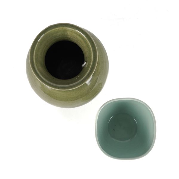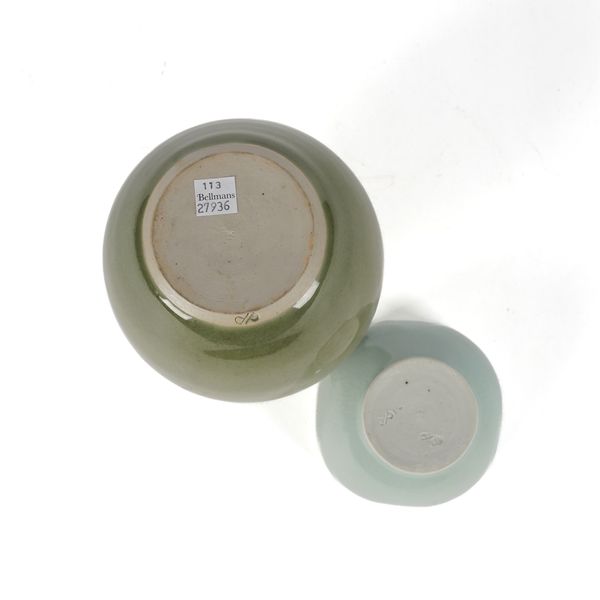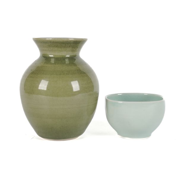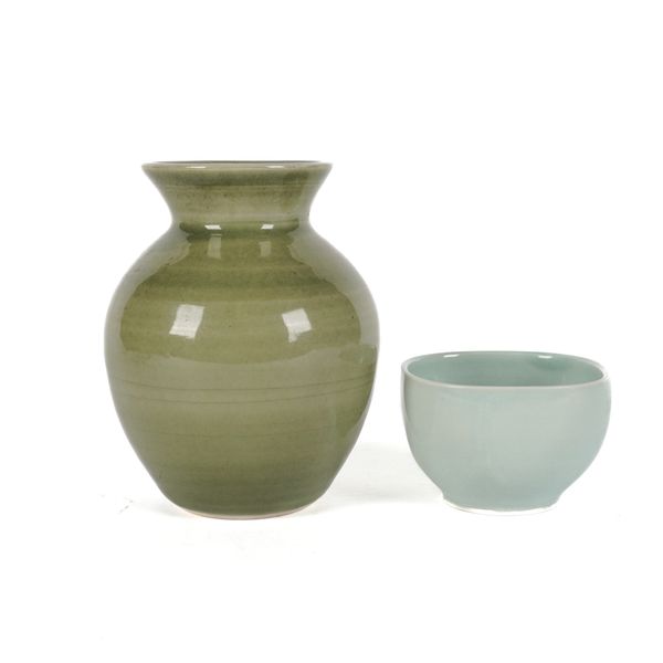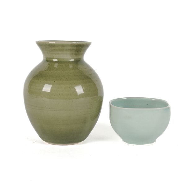 Glazed in olive green of ovoid form with flared mouth, impressed potter's mark to base, 20cm high, together with a Diana Payton squared porcelain bowl with blueish celadon glazed, impressed marks to base