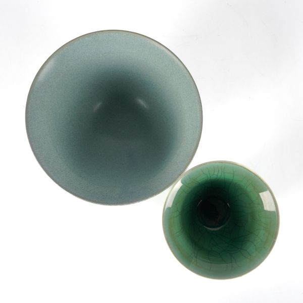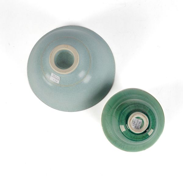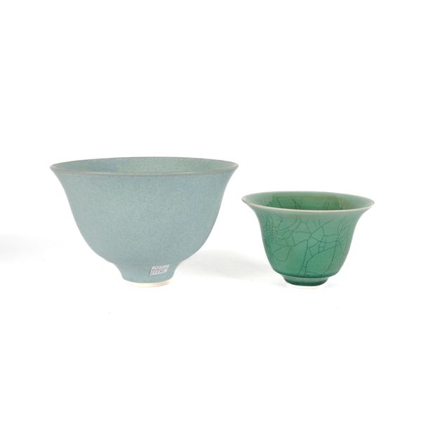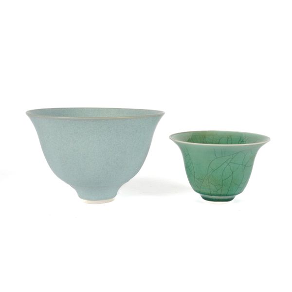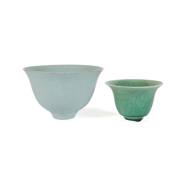 Of flared form, decorated with speckled blue glaze, impressed mark to foot rim, 12.5cm high, 18.5cm diameter, together with a similar Modernist style bowl of smaller size, flared form with green crackle glaze, impressed marks to foot rim
