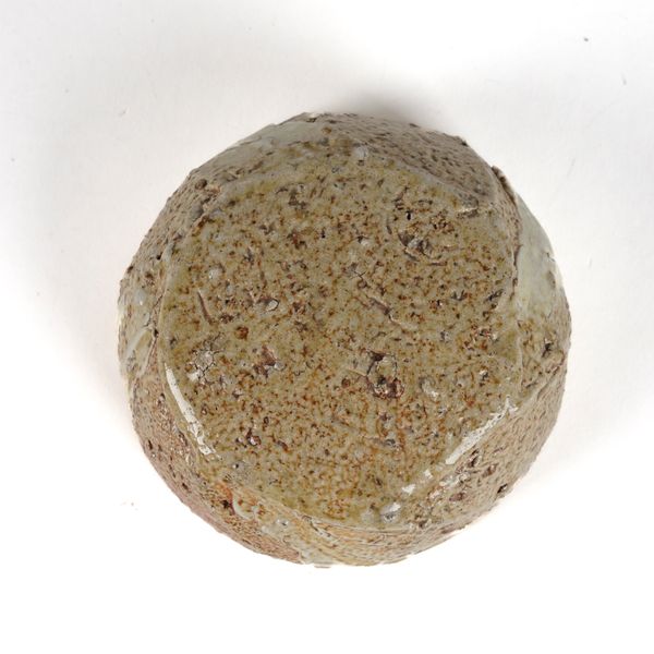 Of ovoid form, hand-thrown in course, grogged clay, decorated with cream/white glaze in a twist pattern, raised on four feet, impressed potter's marks to foot, 28cm high