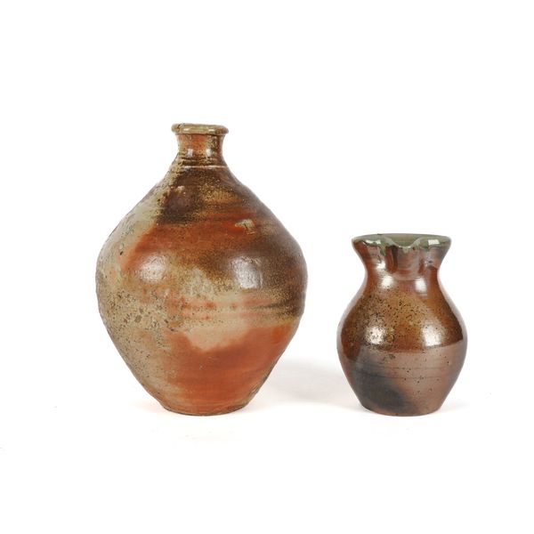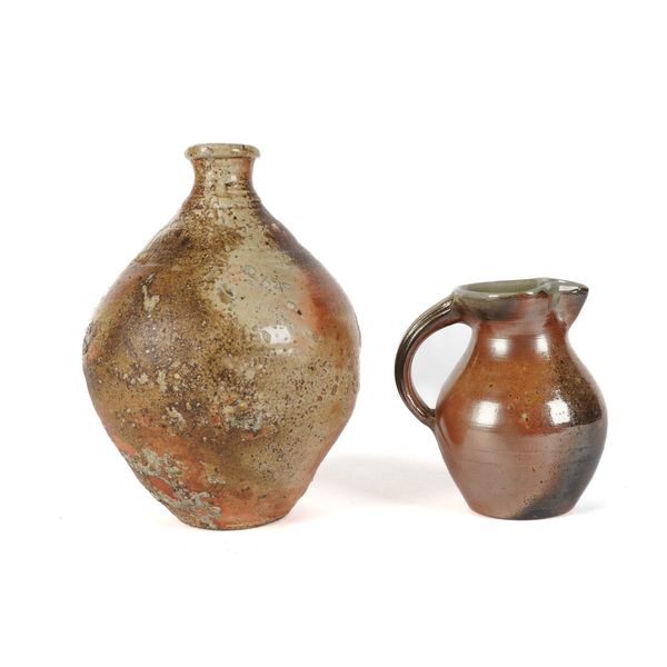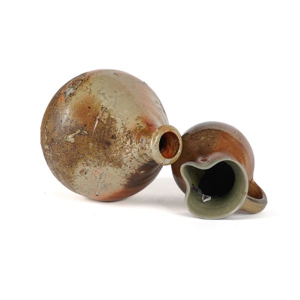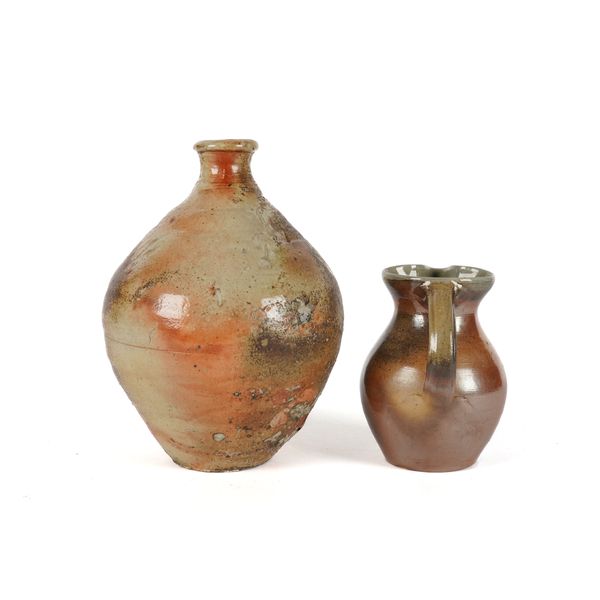 With pink-orange shino glaze to exterior, wood-fired on shells with natural ash glaze deposits, inscribed signature to base, together with Svend Bayer studio pottery jug with natural ash glaze to exterior, the interior glazed in grey-blue celadon