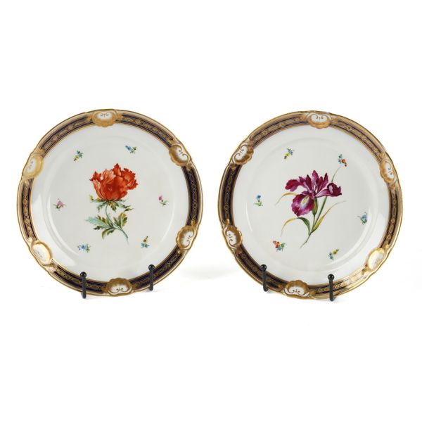 Late 19th century One painted with purple irises to centre, the other with a red flower, possibly peony, each with gilt cobalt blue border, 'Beehive' underglaze mark and stamped '808' marks to base, 20cm diameter