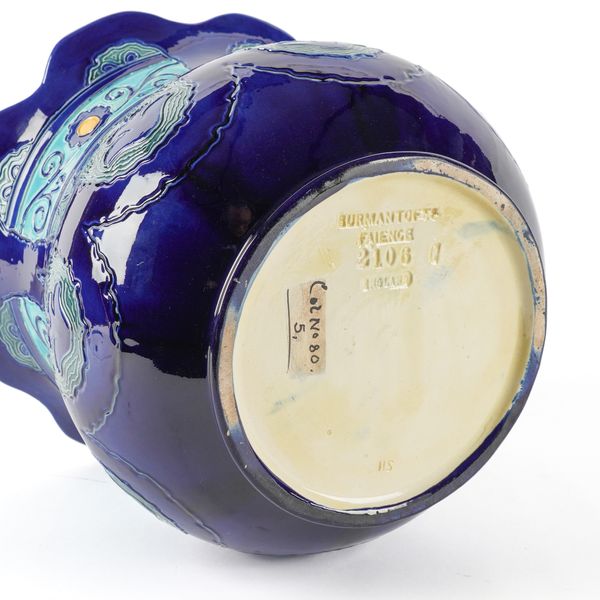 1890'S Bulbous form with waisted neck and scalloped rim, tube-lined with foliate designs against a cobalt blue glazed ground, impressed marks, 29cm high