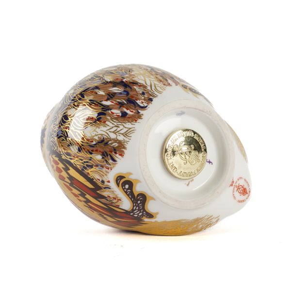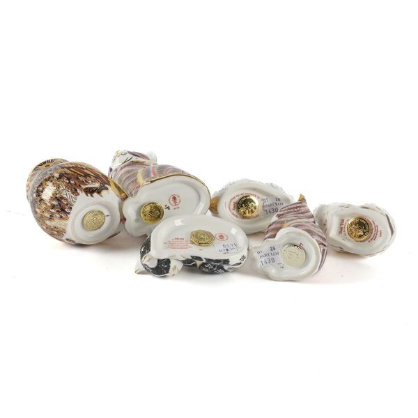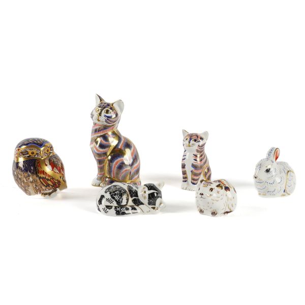 Together with five other Royal Crown Derby paperweights comprising a gold-stopper owl, a gold-stopper 'Bunny', a gold-stopper 'Bank Vole', a gold-stopper 'Misty' sleeping cat, and a smaller silver-stopper cat