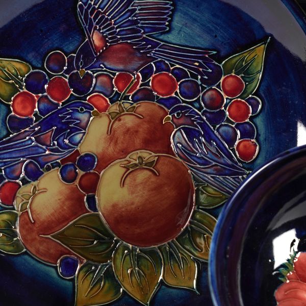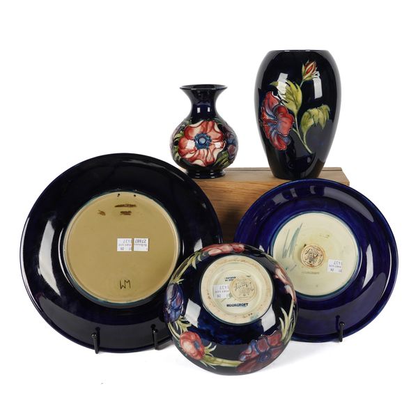 Comprising a 'Clematis' pattern dish, diameter 22cm, stamped, inscribed marks and paper label to base, an 'Anemone' pattern footed bowl with stamped, inscrbed marks and paper label to base, an ovoid 'Hibiscus' pattern vase, 18.5cm high impressed, inscribed marks and paper label to base, a 'Finches' on blue dish, and an 'Anemone' pattern waisted vase, marks and paper label to base