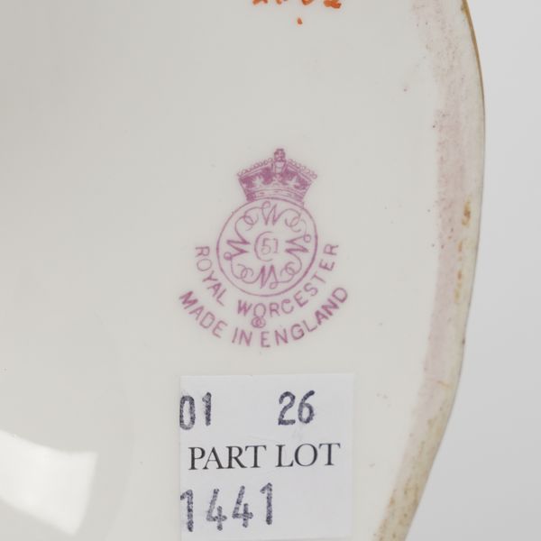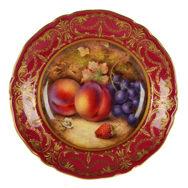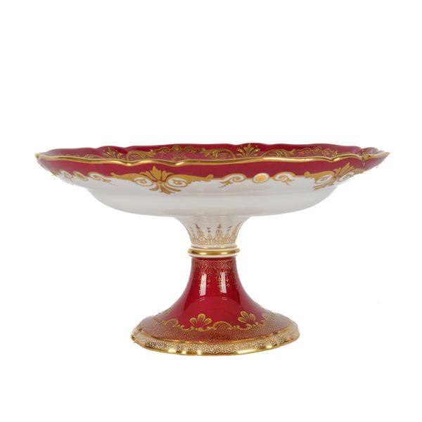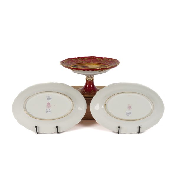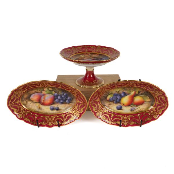 Painted with peaches, grapes, and a strawberry in a central roundel signed by Richard Sebright, the border with raised gilt decoration against a red ground, 13.5cm high 24.5cm diameter, together with two Richard Sebright fruit/dessert oval dishes painted with fruit and having gilt decoration against a red ground border, all marked with puce Royal Worcester back stamp, the oval dishes marked for 1926, the tazza/comport marked for 1931