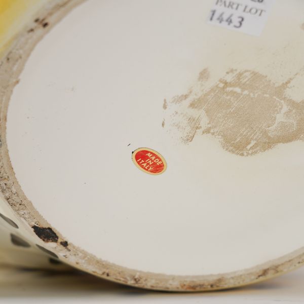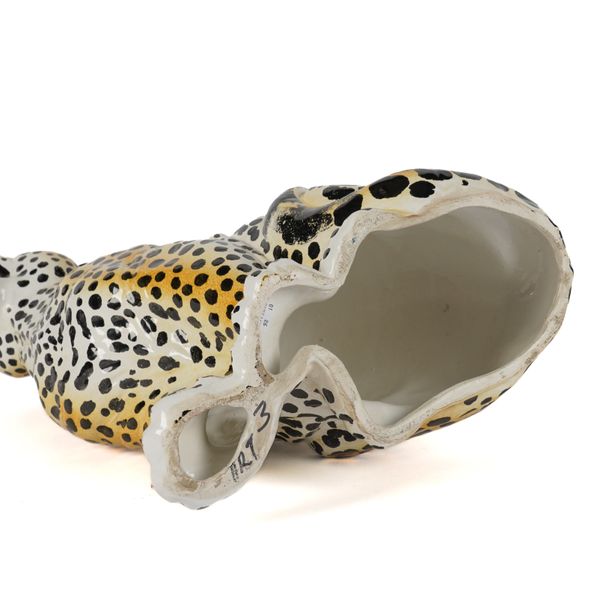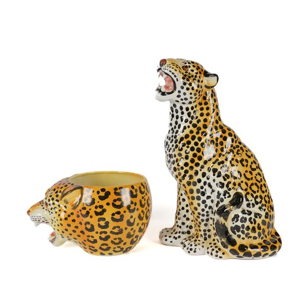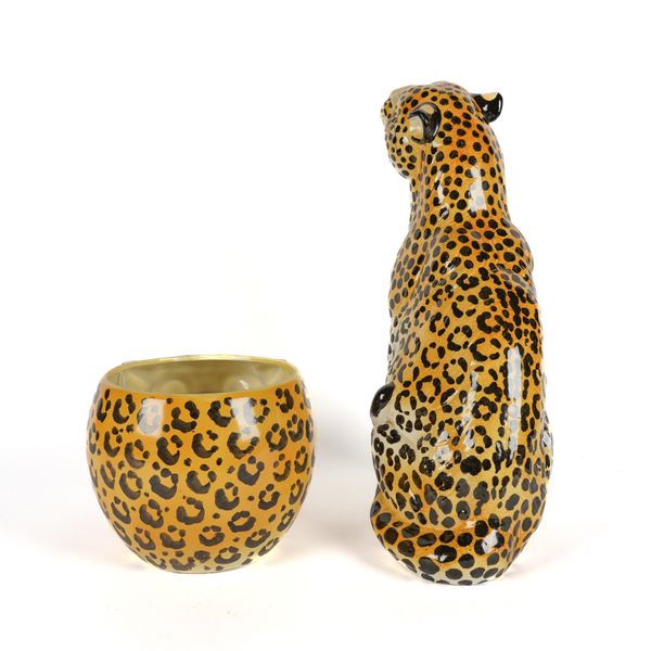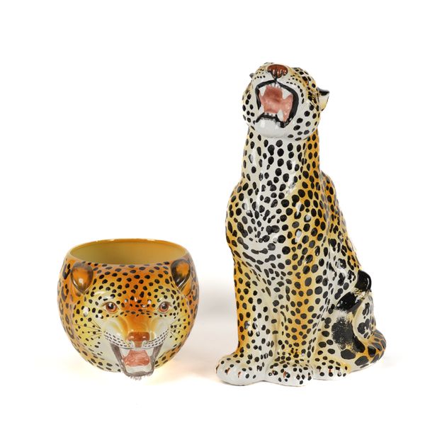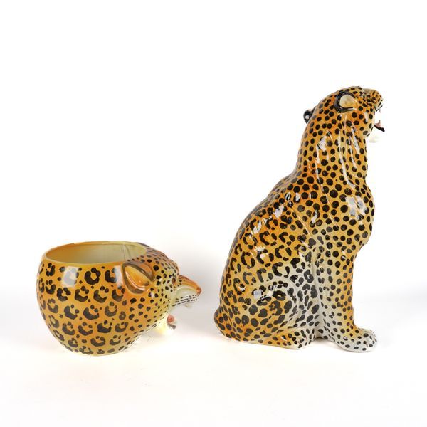 Modelled in seated pose, 52cm high, impressed and inscribed marks to base, together with an Italian Casa Pupo earthenware planter/jardiniere in the form of a leopard's head, paper label to base