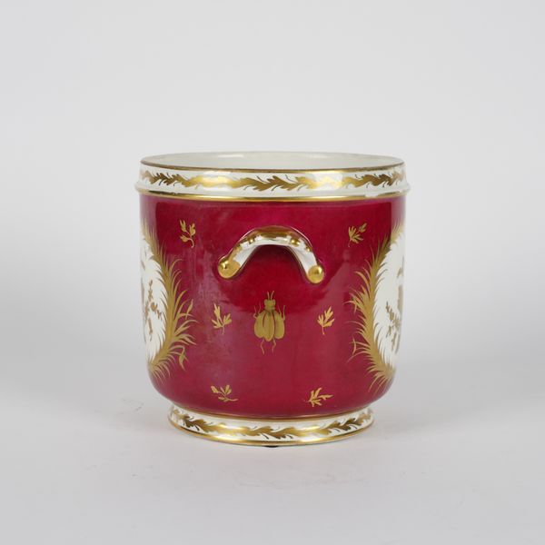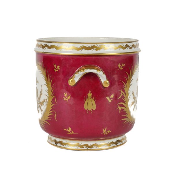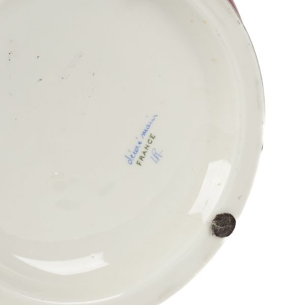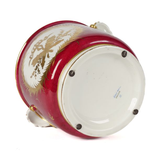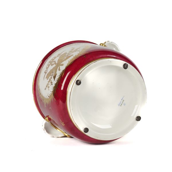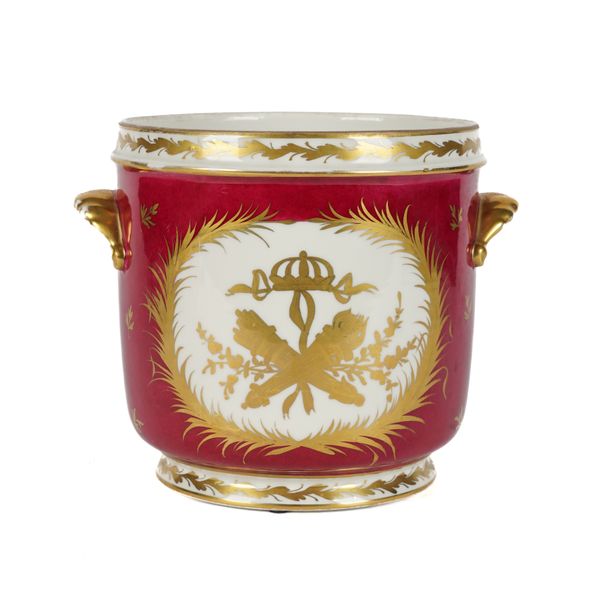 20th century Set with gilt shell moulded handles, each side gilt with military trophies surmounted by a crown against a burgundy ground scattered with bees and leafy sprigs, painted and printed mark, decore main, France, LR, 22cm high