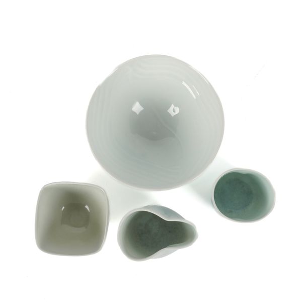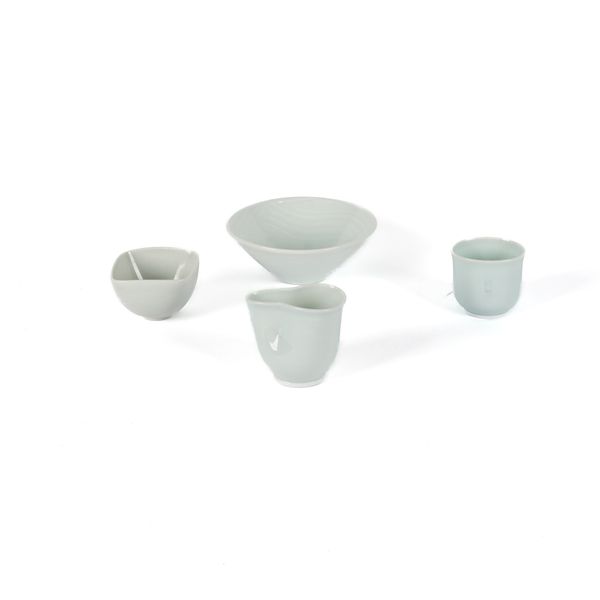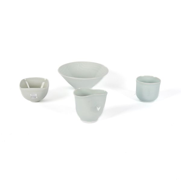 Comprising a pale blue/green Joanna Howells conical bowl with waved design, impressed mark to base, 15cm diameter, a milk jug a yunomi by Clare Wratten, and a small squared bowl with craquelure glaze by Sarah Jane Selwood