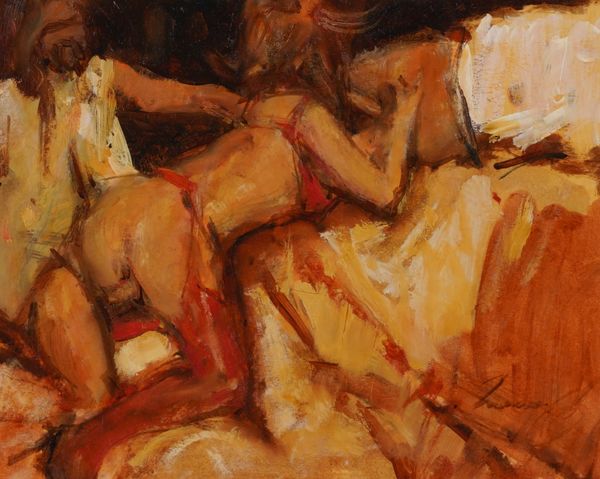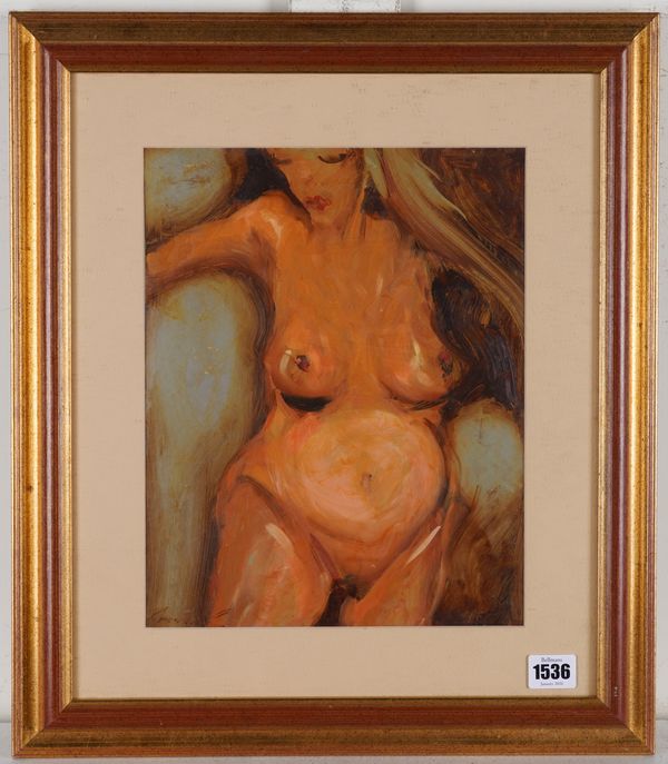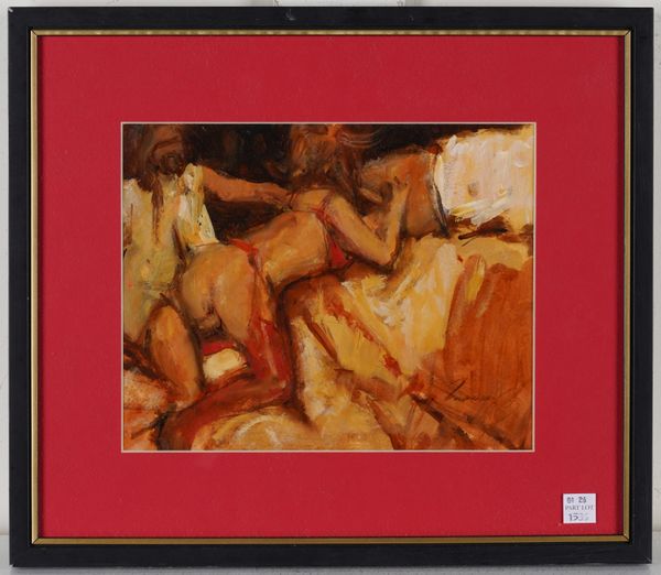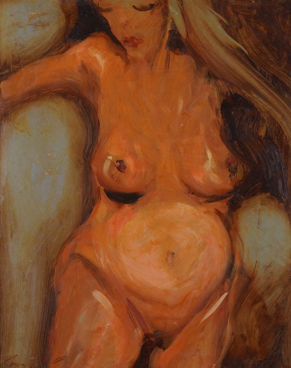 Portrait of a pregnant lady signed 'Moroney' (lower left) acrylic 31 x 24.5cm together with a pair of erotic works by the same hand (3) ARR