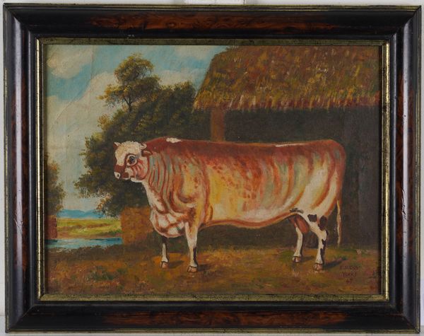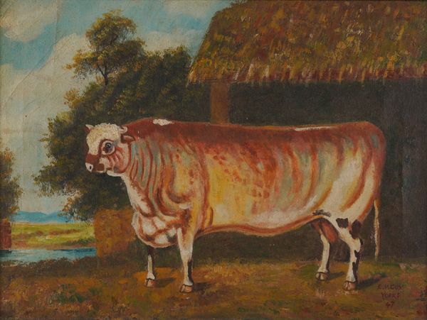 Study of a bull signed and dated 'E. V. COX, YORKS 47' (lower right) oil on canvas 30 x 40.5cm