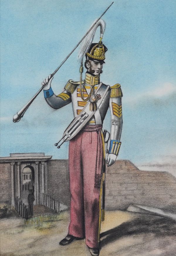 together with a watercolour of a soldier in a red coat, 57 x 39cm, (unframed); a watercolour of a soldier on horseback, 25 x 37.5cm; a watercolour of a soldier holding a staff, 30 x 21cm; and a coloured print of a soldier, 25 x 16.5cm