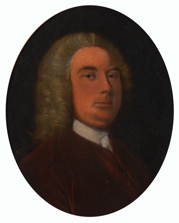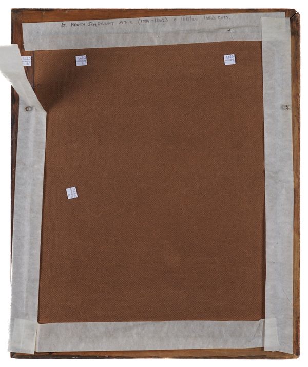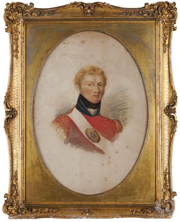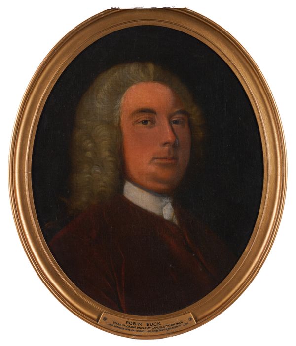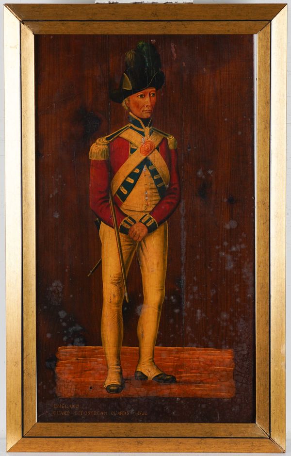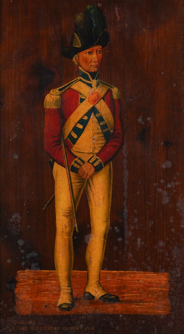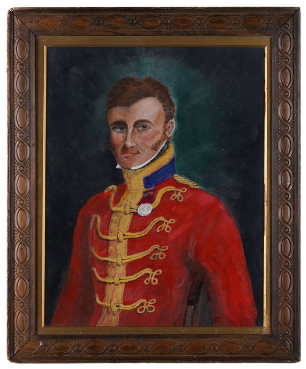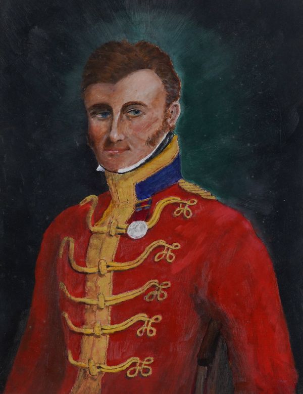 together with three other portraits; an oil on board of a soldier with blue eyes, in red uniform, 46.5 x 36.5cm; a print on board of A Coldstream Guard, 60 x 33cm; and a print on board of a gentleman, thought to be Robin Buck, 49 x 39cm, oval