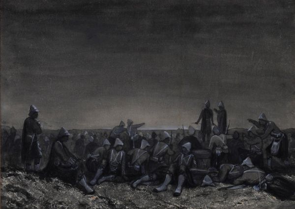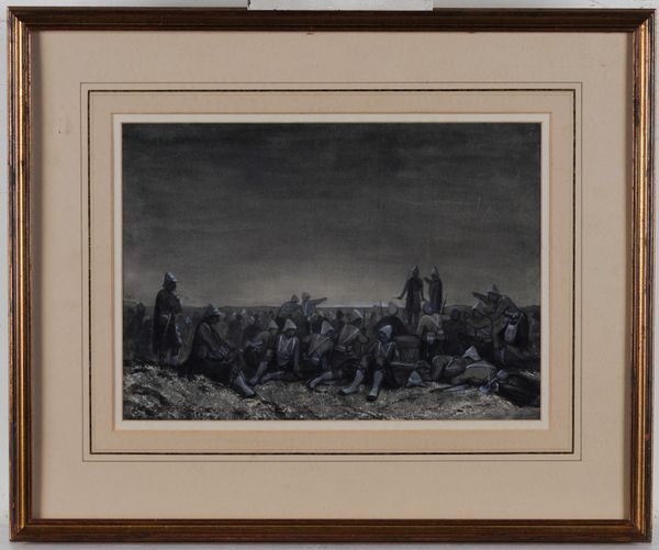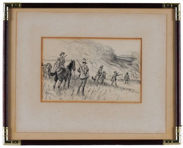 Boers burning grass signed 'HJohnson' (lower left) pen and ink 18 x 28cm together with a watercolour of soldiers at the break of dawn, signed 'C WYNDHAM' (lower left), 24 x 34cm (2)